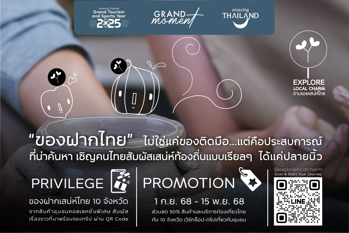 การท่องเที่ยวแห่งประเทศไทย (ททท.) และพันธมิตร เปิดตัวโครงการ “Explore Local Charm ตามรอยเสน่ห์ไทยส่งเสริมการท่องเที่ยวภายในประเทศ ภายใต้แคมเปญ Grand Moment ในธีม Grand Moment of Giving สร้างประสบการณ์การท่องเที่ยวที่น่าจดจำและมีความหมายให้กับนักท่องเที่ยว ผ่านการ “ให้” สิ่งดี ๆ กลับคืนสู่สังคมและชุมชน มุ่งยกระดับสินค้าและบริการท่องเที่ยวของชุมชนให้มีอัตลักษณ์ที่โดดเด่นและมีมูลค่าเพิ่ม โดยใช้ “สินค้าของฝาก” เป็นจุดเริ่มต้นในการเชื่อมโยงภูมิปัญญา รากเหง้าวัฒนธรรม วิถีชีวิ และเรื่องราวท้องถิ่นของไทยเข้ากับประสบการณ์การท่องเที่ยวร่วมสมัย พลิกมุมมองจากสินค้าของฝากที่เป็นเพียงสินค้าที่ระลึก ให้กลายเป็นจุดเชื่อมที่ชวนให้ผู้บริโภคและนักท่องเที่ยว ตามรอยกลับไปยังชุมชนต้นทาง ด้วยการรังสรรค์ผลิตภัณฑ์ชุมชนให้โดดเด่น เพื่อต่อยอดสินค้าของฝากให้เป็นคอลเล็กชั่นพิเศษ พัฒนารูปแบบบรรจุภัณฑ์ใหม่ ทำโปรโมชั่นทางการตลาด พร้อมสอดแทรกการเล่าเรื่อง (Storytelling) ใน QR Code ที่จะปรากฏอยู่บนผลิตภัณฑ์ ให้นักท่องเที่ยวสามารถสแกนรับชมเรื่องราวเบื้องหลังของสินค้า พร้อมทั้งเชื่อมต่อกับระบบจองกิจกรรมหรือทริปท่องเที่ยวในแหล่งผลิตเพื่อทำการจองได้ทันที ถือเป็นการสร้างประสบการณ์การท่องเที่ยวผสมผสานกับนวัตกรรมในรูปแบบใหม่ ที่สามารถเชื่อมโยงผู้คนกับวัฒนธรรมและชุมชนต้นทางได้อย่างลึกซึ้ง และนำไปสู่การสร้างรายได้กลับคืนสู่ท้องถิ่นอย่างยั่งยืน