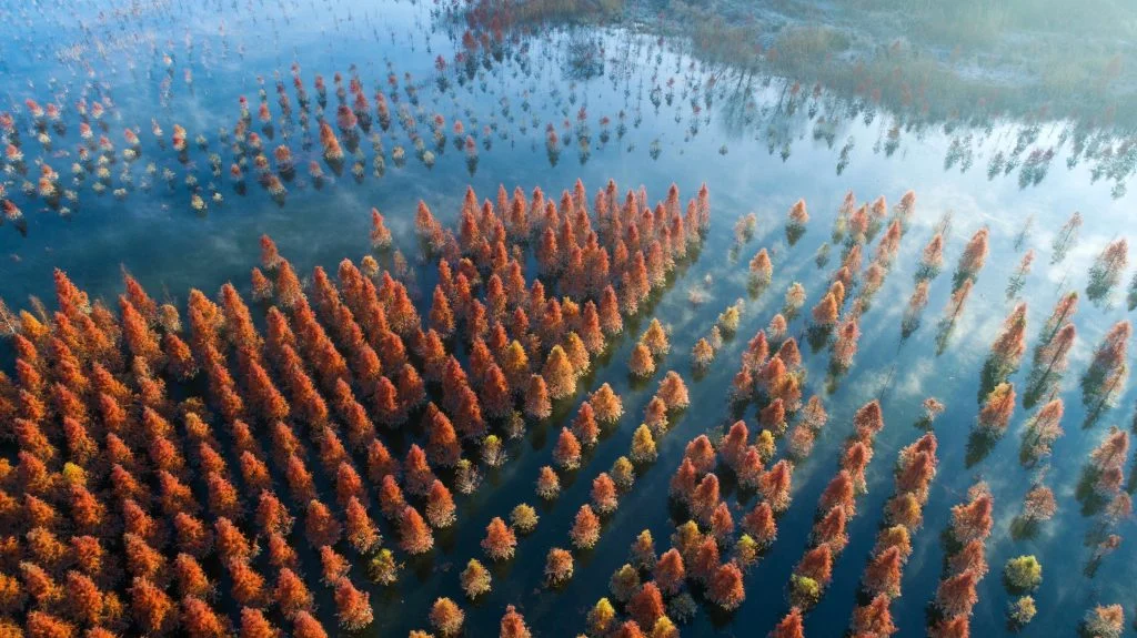 คำบรรยายภาพ: ภาพมุมสูงเผยให้เห็นการทำงานของเจ้าหน้าที่ในอุทยานพื้นที่ชุ่มน้ำหยงชาง ใกล้กับทะเลสาบเตียนฉือในเมืองคุนหมิง เมืองเอกของมณฑลยูนนานทางภาคตะวันตกเฉียงใต้ของจีน